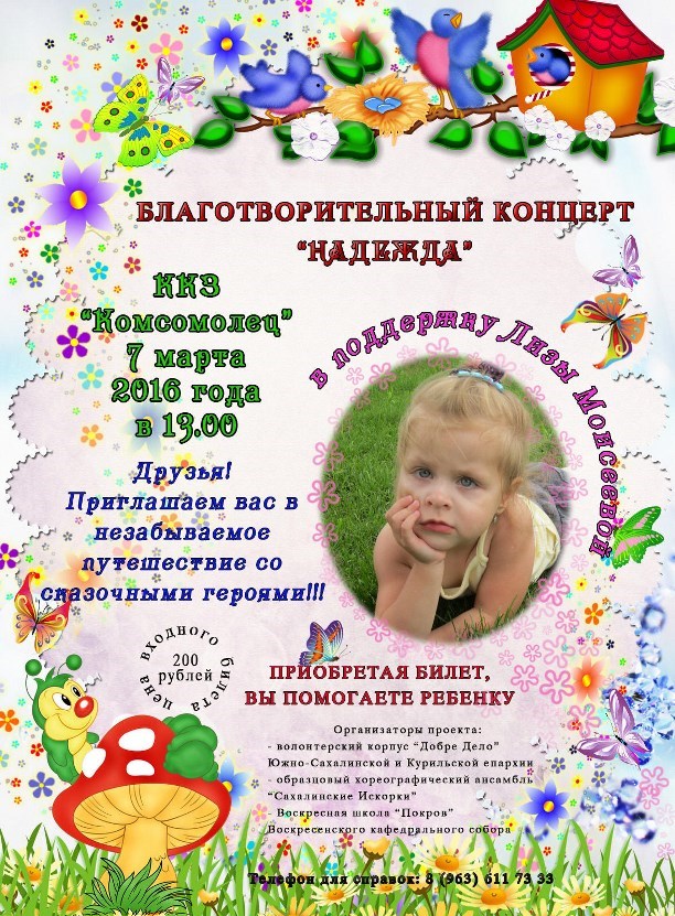 7 марта в Южно-Сахалинске пройдет благотворительный концерт "Надежда". Собранные от продажи билетов средства будут переданы налечение пятилетней сахалинки Лизе Моисеевой. У девочки сразу несколько диагнозов: органическое поражение центральной нервной системы, ДЦП, спастическая диплегия, задержка речевого развития, сходящееся косоглазие. До 4 апреля им надо собрать сумму, необходимую для прохождения реабилитации в Челябинске.