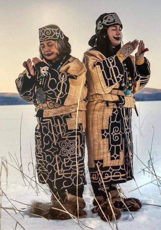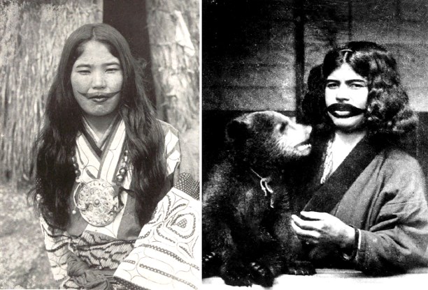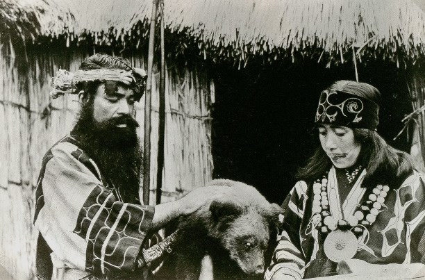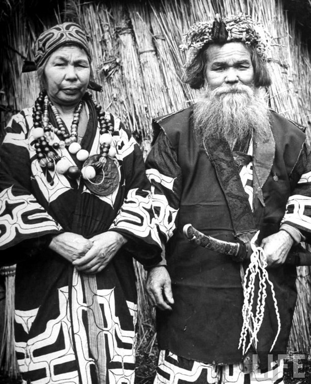 Чета айну в традиционной одежде. Заметьте, у женщины на бусах бронзовое зеркало.