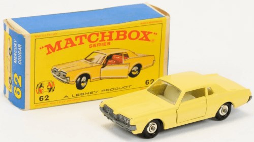 И недавно одна из таких старых игрушек была продана за рекордную сумму 22050 фунтов. Это крошечная машинка «Mercury Cougar». Подобные коллекционные игрушки и без того недёшевы, но этот конкретный автомобильчик отличает удивительная деталь — он окрашен в жёлтый цвет, а не в зелёный металлик, как положено.