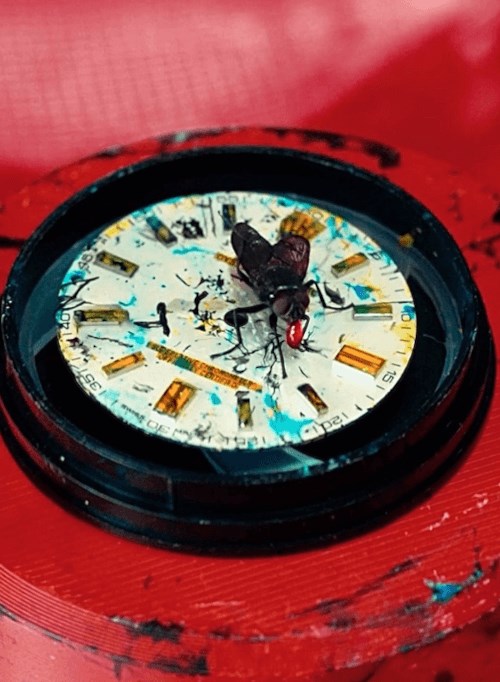 Взяв часы «Rolex», выдумщики превратили их в произведение искусства, использовав труд мух. Часы поместили в контейнер, туда же напустили мух, а также не забыли набрызгать множество капелек краски. Суть в том, что мухи, ползая по краске, после пересаживались на часы и лапками оставляли хаотичные мазки. Некоторые насекомые и вовсе пытались есть краску, после чего их рвало на несчастный циферблат. Готовые часы стали главным призом в розыгрыше, устроенном арт-студией.