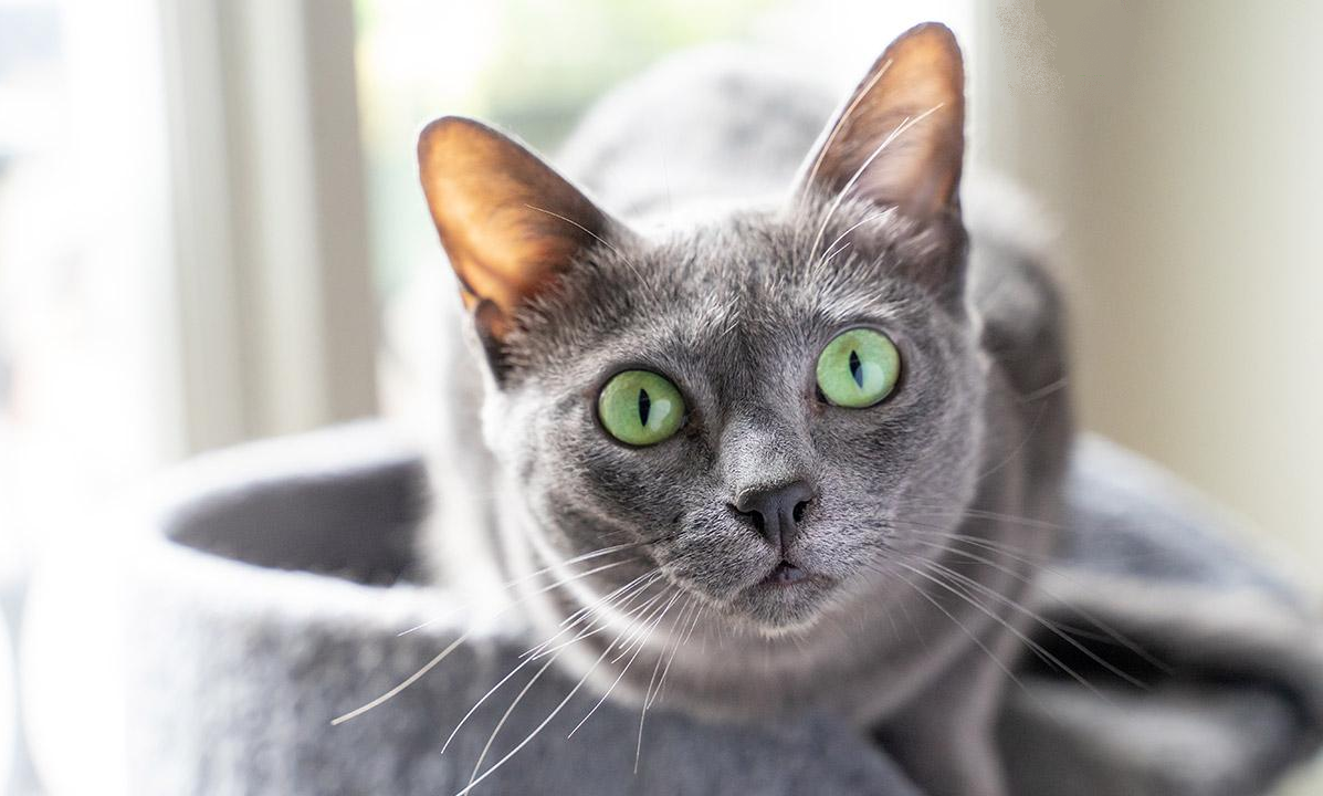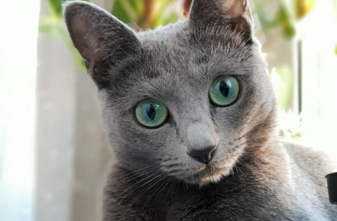 Большие, широко поставленные глаза идеально круглой формы ярко-зелёного цвета создают поразительный контраст с серебристо-голубой шерстью.