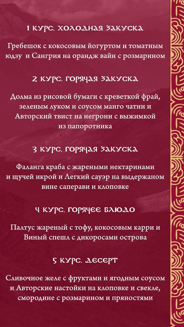В программе вечера - пять незабываемых блюд, а также горячительные напитки от шеф-бармена. Гостей ожидает музыкальное сопровождение, и возможность увидеть финальное приготовление блюд и их раздачу. Мы предусмотрели тесное взаимодействие между гостями и шеф-поварами, которые поделятся историями о происхождении каждого блюда.