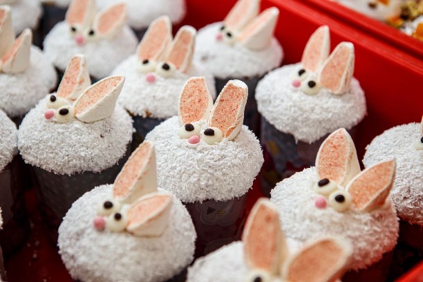Главный символ праздника - куличи - у пекарей и кондитеров получаются ароматными, мягкими, ноздреватыми, украшенными россыпью цукатов, орехов, цветных "бусинок". Это и творожный с изюмом, и шоколадный с цукатами, и апельсиновый с добавлением цедры. Для мальчишек и девчонок пекари колдуют над малышами по классической рецептуре - "Зайчиками" и "Цыплятами".