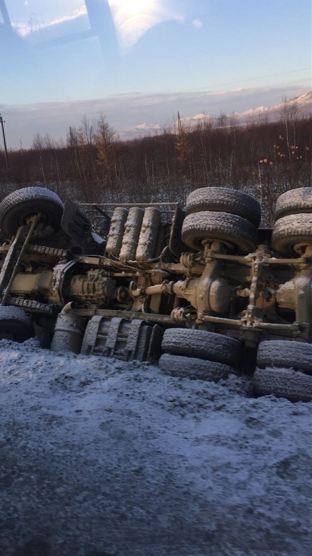 11:10. В Холмске на улице Лермонтова, в районе магазина "Ларчик", на гололеде в кювет улетела кран-балка