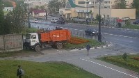 По предварительной информации, водитель мусоровоза, поворачивая налево к придомовым территориям, не справился с управлением, снес дорожное ограждение, переехал клумбу и врезался в забор телецентра.