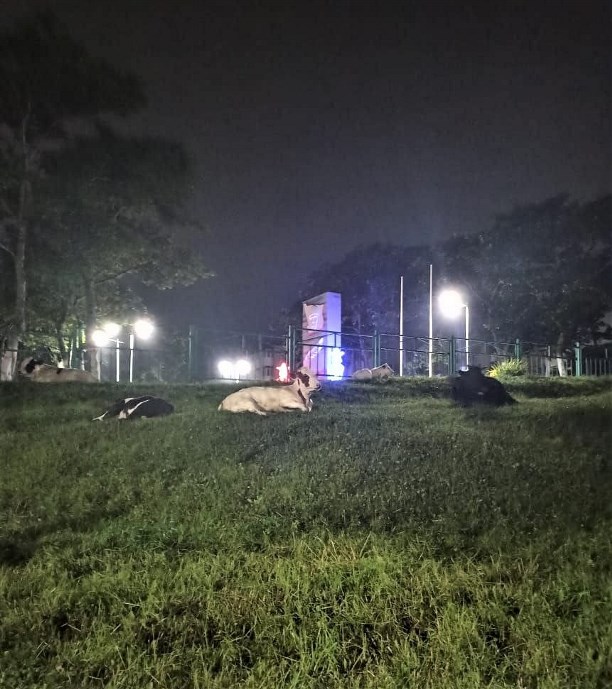Автор снимков призвал хозяина стада возместить ущерб, которые нанесли его животные общественному месту. Вычислить его, вероятно, не очень сложно, так как на коровах висят бирки.