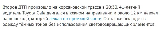 Второе ДТП произошло на корсаковской трассе в 20:30. 41-летний водитель Toyota Gaia двигался в южном направлении и около 12 км наехал на пешехода, который лежал на проезжей части. Он также был одет в одежду тёмных тонов без использования световозвращающих элементов.