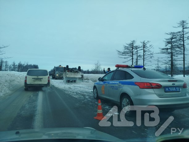 В пригороде Южно-Сахалинска утром 11 февраля произошло серьёзное ДТП. В результате происшествия небольшой грузовик опрокинулся на крышу.