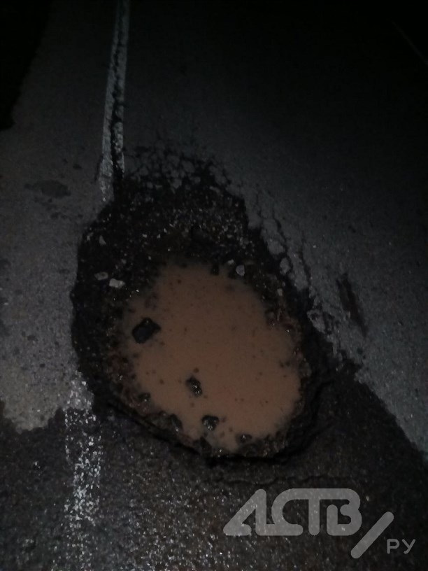 Островитянка повредила диски, наехав на глубокую яму на трассе. Кадры появились в распоряжении astv.ru.