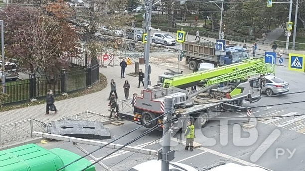 Упавший груз разворотил дорожное ограждение. Движение в районе ДТП затруднено: автокран пытается удалить с проезжей части деталь.