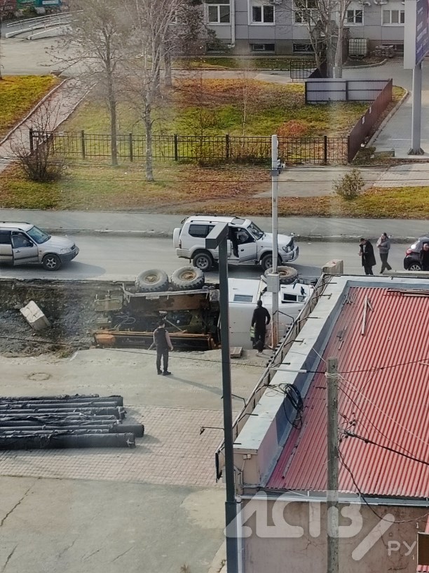По предварительной информации, водитель КамАЗа, двигающегося на север по проспекту Мира, не справился с управлением. Машина упала в котлован на дороге в районе улицы Пионерской.