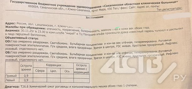 В предоставленной ею медицинской выписке указано, что у девушки диагностированы химические ожоги глаз и повреждение спины.