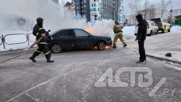 В Южно-Сахалинске утром 10 декабря вспыхнул автомобиль. По словам очевидца, загорелось одеяло, которым владелец укрыл двигатель под капотом.