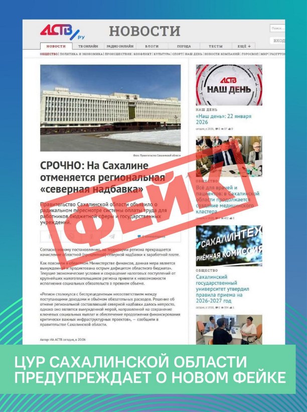 В соцсетях распространяется недостоверная информация об отмене северной надбавки в Сахалинской области. Для распространения слуха злоумышленники подделали страницу сайта astv.ru.