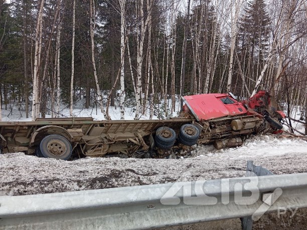 В Тымовском районе длинномер сошёл с трассы. По предварительным данным, большегруз не вписался в поворот и улетел в кювет, смяв дорожное ограждение.