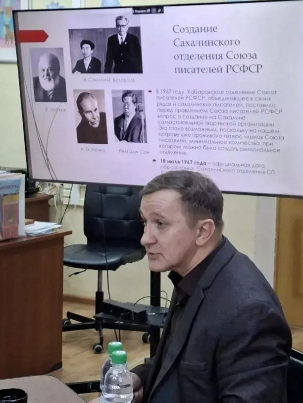 Анна Сафонова подробно рассказала о своей недавней поездке в Луганскую Народную Республику на литературный фестиваль "Муза Новороссии". Владимир Семенчик представил презентацию, посвященную истории и сегодняшнему дню Сахалинского отделения Союза писателей России.