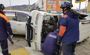 Автомобиль опрокинулся при ДТП на улице Комсомольской в Южно-Сахалинске