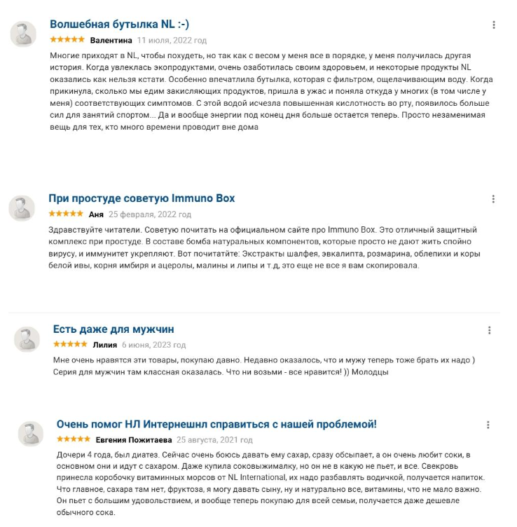 Отзывы о биодобавках NL не менее позитивные. Авторы пишут об улучшении состояния волос и кожи, укреплении иммунитета, снижении частоты простудных заболеваний. Немало положительных откликов собирают косметические средства — часто продукцию NL покупают для всех членов семьи.