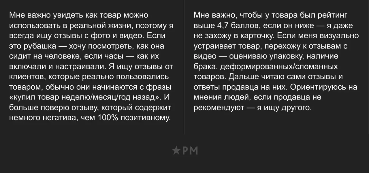 У разных поколений свои ценности, но всем важно одно — чтобы отзывы были подробными и показательными, а ответы продавцов — персональными и по делу.