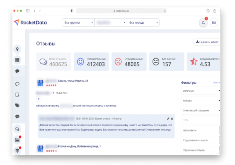RocketData. Можно обновлять контактную информацию для всей сети из одного кабинета: адрес, телефон и режим работы автоматически обновляются на различных геосервисах. Сервис интегрирован с 2GIS, Google Maps, Яндекс Картами, Apple Maps, OSM, навигаторами (Яндекс, Google и др.). Кроме того, он собирает отзывы клиентов из разных источников в одном месте, позволяя быстро на них реагировать, проводить анализ для маркетологов.