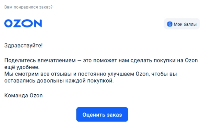 В приложении Wildberries всегда просят поделиться впечатлением о товаре, а некоторые продавцы кладут карточки с просьбой оставить отзыв прямо в упаковку. Иногда даже обещают начислить за него 100 рублей. Однажды из интереса я попробовала их получить, но это был обман. С тех пор я выкидываю такие карточки. Мне не сложно оставить отзыв, если компания пишет, что ей важно мое мнение или это поможет ей стать лучше, как это делает Ozon.