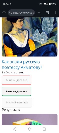 Данный тест встроен на сайт astv.ru с интернет-ресурса "Конструктор тестов". Сайт astv.ru не несет никакой ответственности за опубликованные в тесте фотографии и не отвечает за соблюдение авторских прав создателем теста. Контакты владельца интернет-ресурса "Конструктор тестов" указаны на сайте https://konstruktortestov.ru/.
