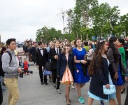 В Южно-Сахалинске прошел первый в истории областного центра городской праздник выпускников «Вслед за мечтой». Из-за холодной погоды организаторы значительно сократили программу мероприятия. И не напрасно — некоторые юноши и девушки не захотели прятать свои нарядные туалеты под верхней одеждой и стойко выдерживали испытания пронизывающим ветром.