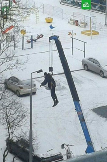 Рабочий не залез на столб с помощью каких-либо приспособлений и не делал ремонт с платформы, вместе с которой ремонтников обычно поднимают наверх специальные машины. Вместо этого ему помог кран-стрела. Он подцепил мужчину сзади за ремни, которыми тот обвязался, и висевший на крюке рабочий спокойно занимался своими делами.