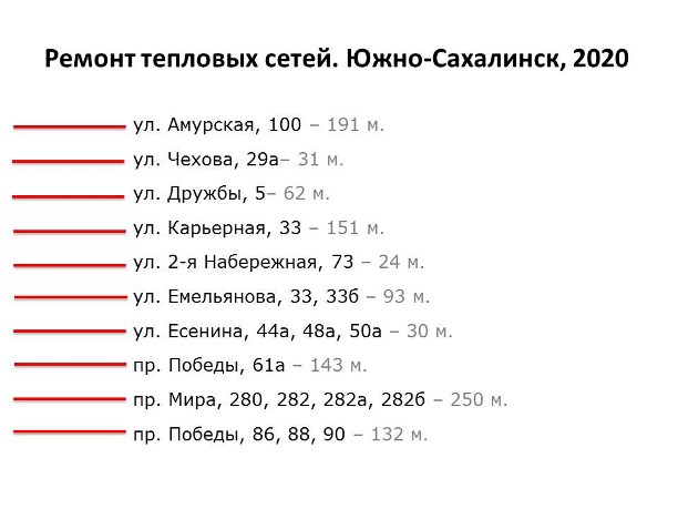 Ремонтные и строительные работы будут вестись на 23 участках Южно-Сахалинска. Основная часть запланирована на летние месяцы и начнется сразу после завершения отопительного сезона и проведения гидравлических испытаний.