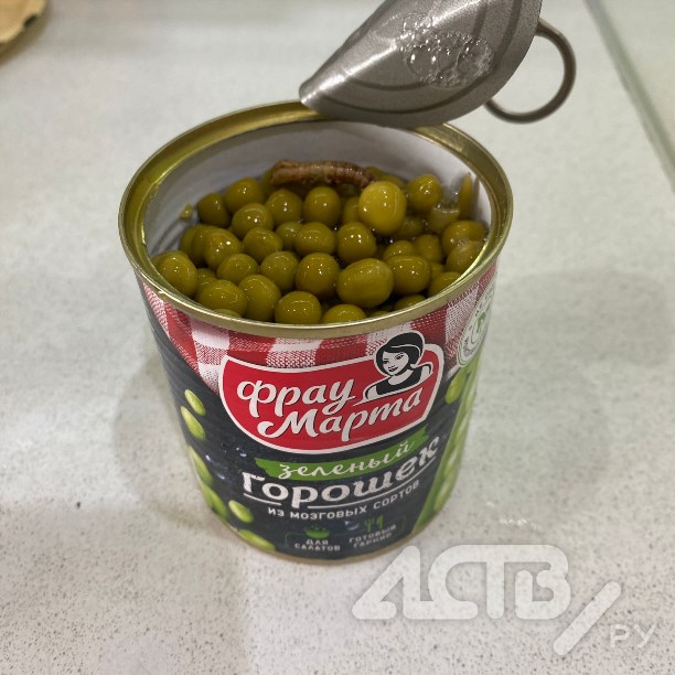 Жительница Южно-Сахалинска купила банку консервированного зелёного горошка с упитанной гусеницей внутри. Видео находки она предоставила редакции astv.ru.