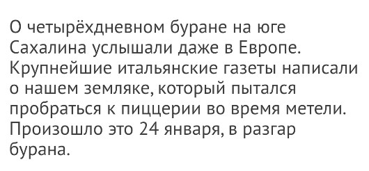 О четырёхдневном буране на юге Сахалина услышали даже в Европе. Крупнейшие итальянские газеты написали о нашем земляке, который пытался пробраться к пиццерии во время метели. Произошло это 24 января, в разгар бурана.
