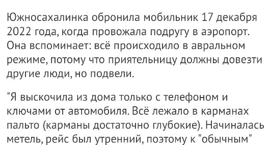Южносахалинка обронила мобильник 17 декабря 2022 года, когда провожала подругу в аэропорт. Она вспоминает: всё происходило в авральном режиме, потому что приятельницу должны довезти другие люди, но подвели.