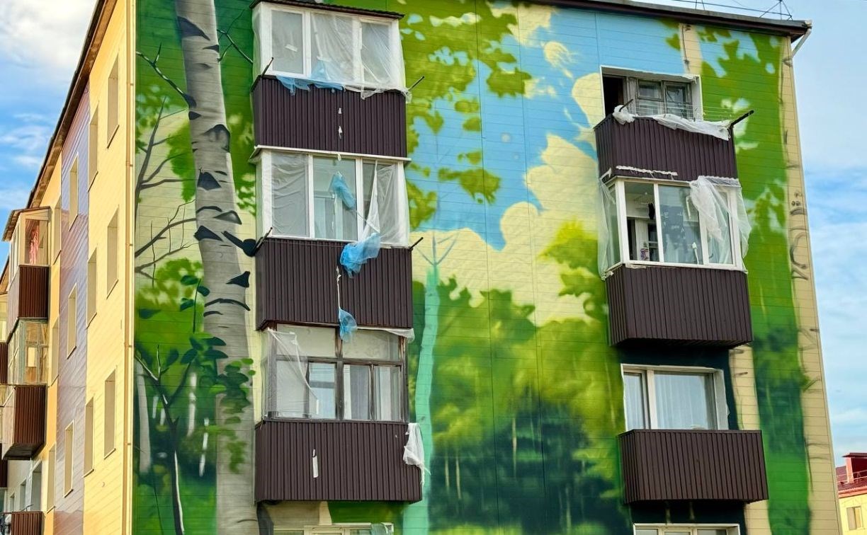 Торец дома на Ломоносова, 11 в Томари украсит мурал. На фасаде здания рисуют берёзовый лес. Проект предварительно согласовали с жильцами. Закончат работу до конца сентября.