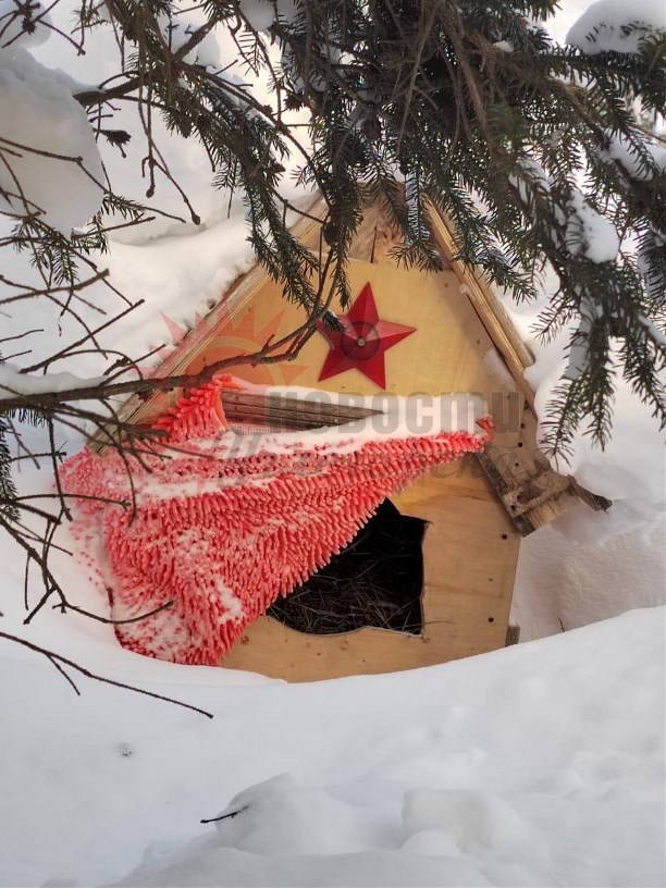 Заботливый человек не только смастерил конуру, но и проложил внутри солому, а вход укрыл яркой тканью. Завершает композицию звезда, которая делает будку особенно заметной среди заснеженного леса.
