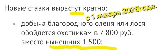 - добыча благородного оленя или лося обойдется охотникам в 7 800 руб. вместо нынешних 1 500;