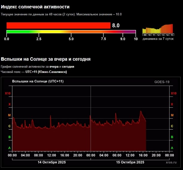 Специалисты отметили, что графики показывают непрерывный рост фонового излучения Солнца, которое за сутки выросло в 4 раза и приближается к уровню М. Иными словами, Солнце в данный момент даже в отсутствие взрывов формирует потоки рентгеновского излучения на уровне сильных вспышек.