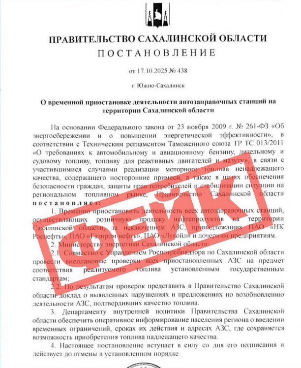 "Подчеркиваем: данное постановление не издавалось и не публиковалось. Правительство Сахалинской области не приостанавливало работу АЗС и не ограничивало доступность топлива для населения островов", — уточняют специалисты.
