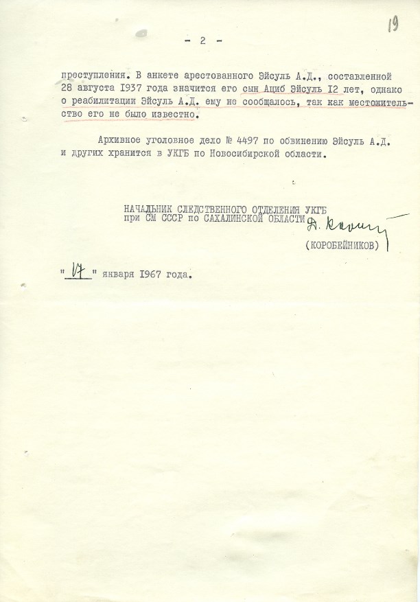 Об этом трагическом периоде своей жизни Ациб Александрович Эйсуль упомянул в заявлении в Сахалинский обком КПСС, написанном 24 января 1967 года:
