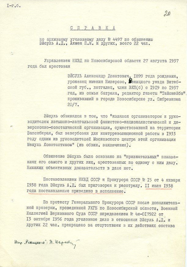 По протесту Генерального прокурора СССР после дополнительной проверки, проведенной УКГБ по Новосибирской области, Военной Коллегией Верховного Суда СССР определением № 4н-017922 от 13 октября 1956 года уголовное дело в отношении Эйсуль А.Д. и других 22 чел. прекращено за отсутствием в их действиях состава преступления".