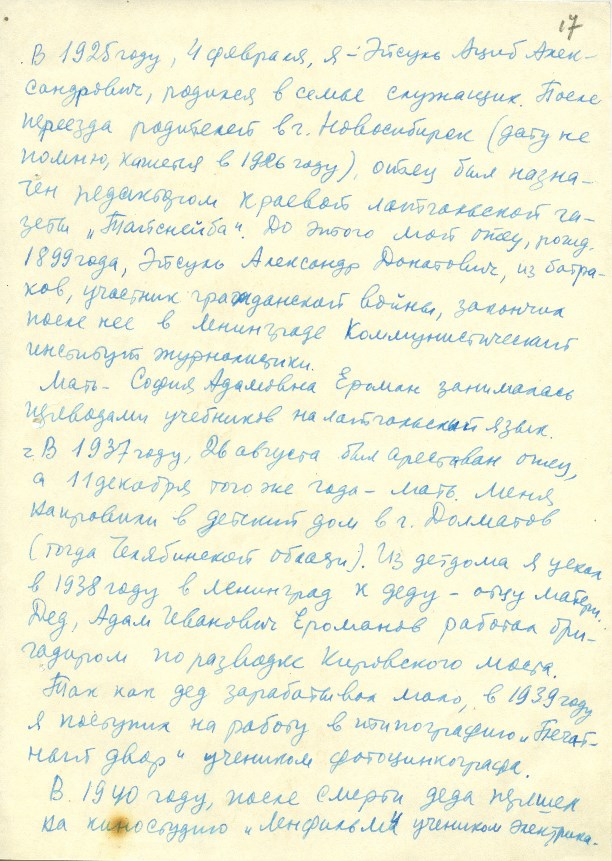 "После ареста родителей меня направили сначала в детприемник, вскоре в детдом на Урал в село Долматово в 123 километрах от Свердловска. В детдоме я пробыл до начала осени 1938 года, а потом сбежал к дедушке в Ленинград".