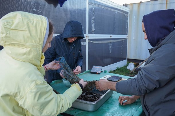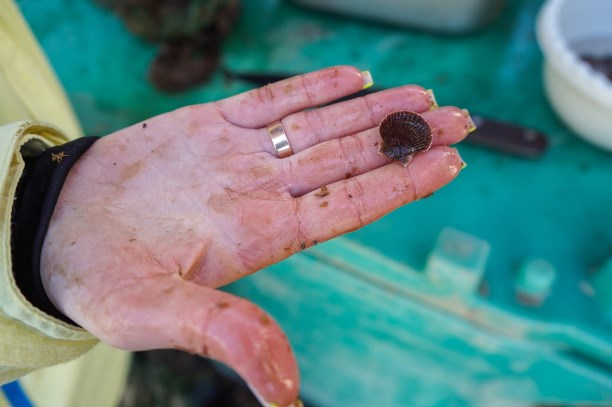 Обойдя несколько "адресов" и взяв на проверку нужный материал, специалисты отправляются на берег. Здесь комиссия проверяет ракушки на целостность, взвешивает, вручную пересчитывает. Важно учесть, успел ли гребешок подрасти до нужного размера. Процесс не быстрый, но он того стоит. Организация занимается разведением данного вида аквакультуры уже не первый год.