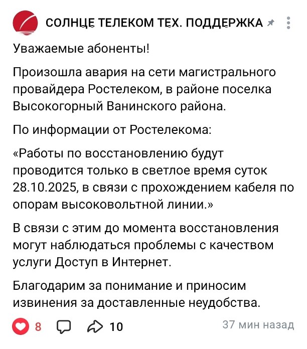 По данным оператора, восстановительные работы смогут проводиться только при дневном свете 28 октября, так как кабель проходит по опорам высоковольтной линии. До устранения повреждения абонентов предупреждают о возможных перебоях в работе сети.