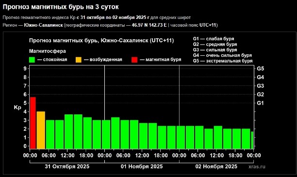 Магнитные возмущения были умеренные, её пик подзней ночью (по сахалинскому времени) достиг уровня G2. События тем не менее хватило для очень значительного усиления зоны полярных сияний.