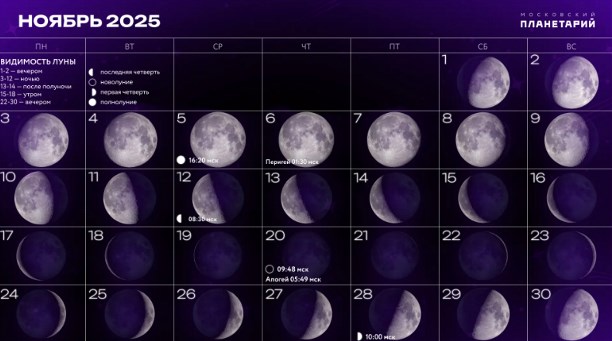 - 6 ноября, 01:30 мск — Луна в перигее орбиты (минимальное расстояние от Земли).