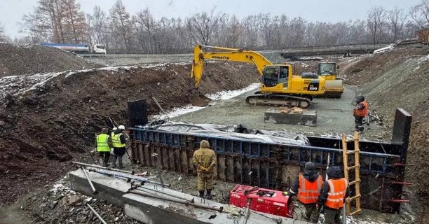 — На месте старого моста выкопан котлован, основание под железобетонную трубу отсыпано скальным грунтом. Также устроено цементогрунтовое основание под откосные стены на входе и выходе трубы, выставлена опалубка для устройства монолитного фундамента под оголовки. Старый мост разобран, конструкции вывезены на полигон ТБО. Работы на объекте нацпроекта ведутся с опережением графика, — рассказал руководитель ГКУ "Управление Сахалинавтодор" Вадим Думанский.