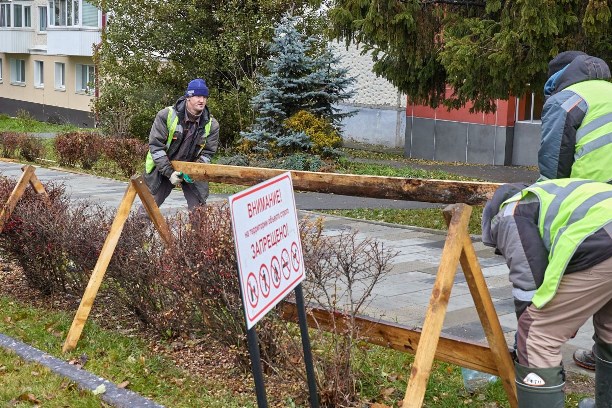 В рамках осенних работ специалисты "Зеленого города" трудятся над созданием надежной защиты для растений. Кустарники, как молодые, так и взрослые, аккуратно связываются, а живые изгороди получают специальные укрытия.