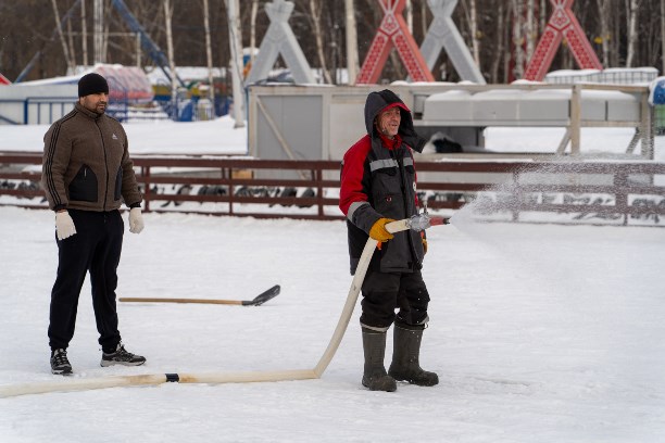 После первого снега и понижения температур была сформирована снежная подушка. Заливку производили в ночь на 5 декабря, а также днём в пятницу. При благоприятных погодных условиях первый каток начнёт работать уже с середины декабря.