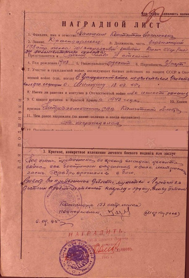 Также из наградного листа стало известно описание подвига Константина Николаевича: "Под огнем, противника во время высадки десанта, вынес все боеприпасы отделения и спас материальную часть. Храбро сражался в бою".