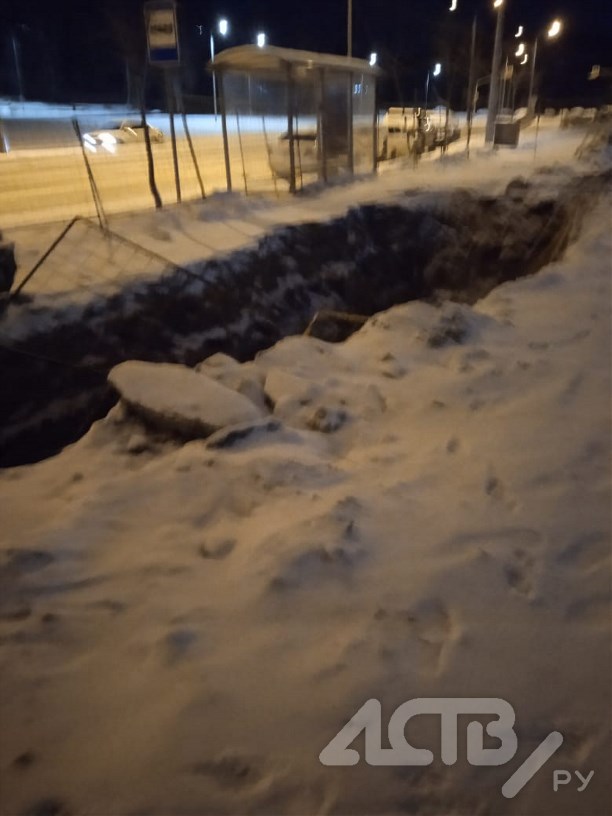 Жители ЖК "Аралия" в Южно-Сахалинске обнаружили утром 17 декабря провал в земле внушительных размеров. Глубокая яма находилась, по предварительным данным, в метре от остановочного павильона, а ограждение по неизвестным причинам лежало прямо в ней.