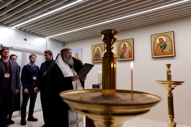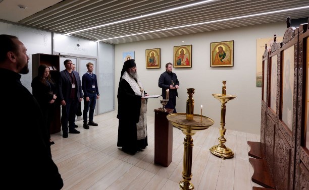 Чин освящения молитвенного пространства совершил архиепископ Южно-Сахалинской и Курильской епархии Никанор. К обряду присоединились верующие сотрудники воздушной гавани.